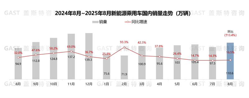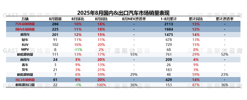 2025年8月,中國汽車市場銷售285.7萬輛,環(huán)比增長10.1%,同比增長16.4%。具體來看,在“兩新”政策及地方普惠性政策的協(xié)同發(fā)力下,國內(nèi)NEV市場同環(huán)比增速均高于整體市場;同時,汽車出口維持高增長態(tài)勢,進一步為8月市場的回升注入強勁動力。