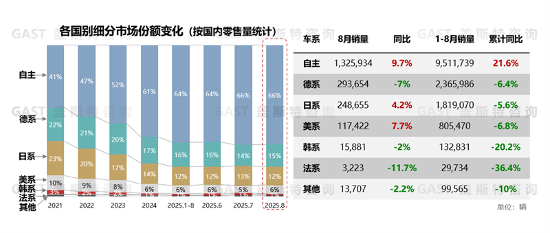 市場份額角度,8月自主品牌市場份額維持在66%,環(huán)比7月小幅下滑0.2個百分點。