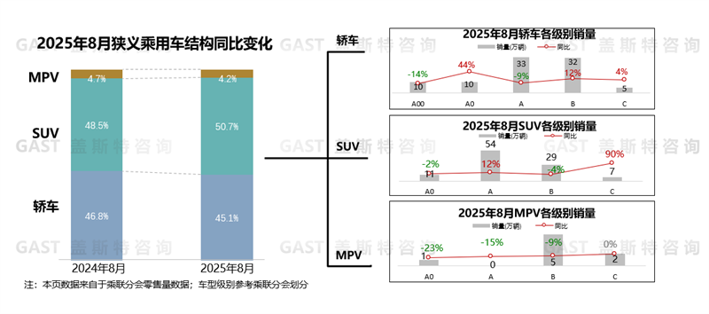 SUV份額為50.7%,同比增長2.2個百分點。A級市場ICE表現(xiàn)較好,8月全新博越上市,銷量超2.4萬輛,同比翻倍增長。B級市場同比小幅下滑,其中Model Y同比兩位數(shù)下滑,較去年同期下滑近6千輛;小米YU7產(chǎn)能提升,單月銷量超1.6萬輛。C級及以上市場同比增幅最高,其中樂道L90上市首月銷量破萬;問界M8銷量連續(xù)三個月超過2萬輛。