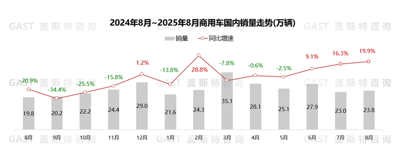 8月,商用車國內(nèi)銷售23.8萬輛,環(huán)比增長3.4%,同比增長19.9%。由于去年同期基數(shù)較低,且政策推動NEV商用車同比增長59%,多重因素共同作用下,國內(nèi)商用車市場實現(xiàn)同比高增長。