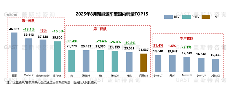 8月,比亞迪在TOP15中占據(jù)7席,仍保持斷層領(lǐng)先;從動力形式看,TOP15中純電車型占據(jù)10席。具體來看,吉利星愿:銷量連續(xù)8個月保持正增長,8月再創(chuàng)歷史新高;宏光MINI EV:8月同環(huán)比增幅均超過35%,月銷量重返3萬輛以上;宋系列:銷量下滑幅度持續(xù)擴大,其中宋PLUS同比下滑超2倍;問界M8:上市后訂單穩(wěn)定增長,且產(chǎn)能持續(xù)爬坡,連續(xù)三個月銷量突破2萬輛,同時也成為TOP15車型中唯一價位在40萬元左右的車型;小米SU7:產(chǎn)能分配上持續(xù)向YU7讓步,銷量已連續(xù)三個月低于2.5萬輛,8月環(huán)比下滑超18%;Model 3:長續(xù)航版上市且推出五年免息政策,月銷量環(huán)比增長超80%;小米YU7:產(chǎn)能穩(wěn)步提升,上市第二個完整月銷量突破1.6萬輛。