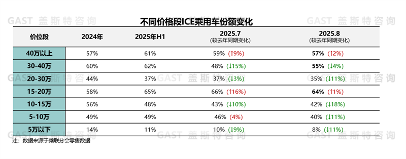 從細分價格帶來看,ICE乘用車在15-20萬元及30萬元以上市場延續(xù)了強勢表現(xiàn),細分市場份額仍超過55%。30萬元以上市場中,BBA等傳統(tǒng)豪華品牌部分車型保持10萬元以上的降價幅度,目前仍占據(jù)該價格段60%份額,但隨著自主品牌加速布局豪華市場,預(yù)計2025年末該區(qū)間ICE份額將下滑至50%以下;15-20萬元市場則因主流合資中高端車型售價下探、自主NEV布局較少,預(yù)計2025年末ICE在該區(qū)間仍有望守住60%市場份額。
