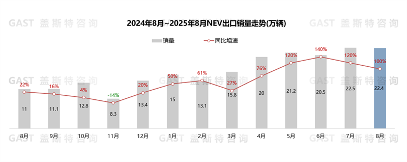 8月,新能源汽車出口22.4萬輛,環(huán)比下降0.6%,同比增長100%,已連續(xù)四個月實現(xiàn)同比翻倍增長。具體來看,NEV乘用車是增長核心動力,8月同比增長1.1倍,其中對墨西哥、土耳其等地區(qū)的出口增量尤為顯著;從動力類型看,BEV和PHEV車型均貢獻超5萬輛的出口增量,且插混車型占NEV出口的份額較去年同期提升16個百分點,成為出口結(jié)構(gòu)中的重要增長極。