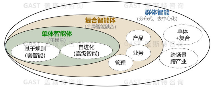 汽車產(chǎn)業(yè)充分體現(xiàn)了這一演進路徑,當前各域部分正處于向單體智能體轉(zhuǎn)型階段;繼而通過產(chǎn)品、業(yè)務、管理多線智能演化,使單智能體復合成整車和企業(yè)智能體;最終構(gòu)建企業(yè)內(nèi)外部智能體協(xié)同交互的群體生態(tài)。