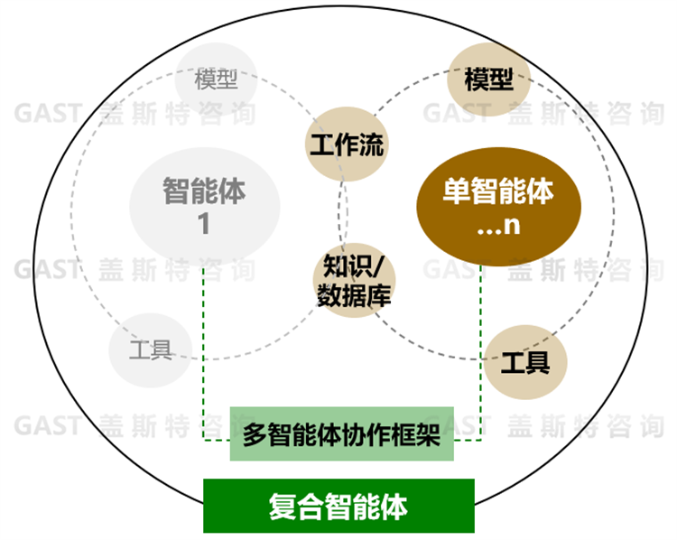當多個單智能體通過多智能體協(xié)作框架集成時,便形成復合智能體的系統(tǒng)性能力。多智能體協(xié)作框架作為復合智能體的構(gòu)建核心,需保障任務銜接和信息傳遞準確。首先作為任務銜接中樞,基于大模型動態(tài)任務分解功能實現(xiàn)子任務分配與跨智能體調(diào)度;其次作為工作流對接引擎,確保多智能體工作流無縫銜接;最終建立統(tǒng)一通信協(xié)議,以標準化數(shù)據(jù)接口與知識庫共同語義框架消除交互歧義。