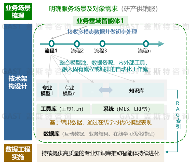 在策略實施層面,基于技術(shù)能力與業(yè)務需求結(jié)合、近期目標與遠期規(guī)劃結(jié)合的原則。短期從重復性強、流程成熟、知識沉淀足的領(lǐng)域切入;長期則構(gòu)建覆蓋研產(chǎn)供銷服等的全業(yè)務復合智能體,實現(xiàn)從單點突破到全局智能的以點帶面的階段性實施。
