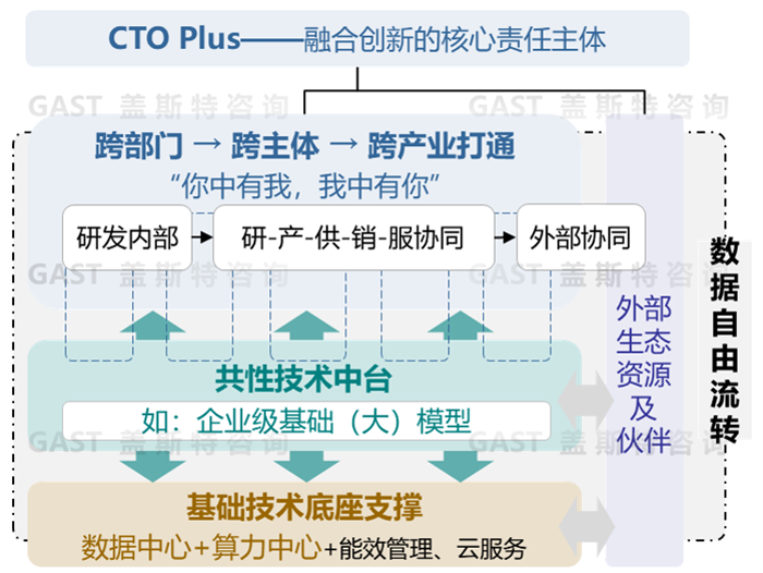 最終,為了能夠?qū)崿F(xiàn)內(nèi)外多個主體的數(shù)據(jù)自由流轉(zhuǎn),支撐CTO Plus與各主體的研發(fā)決策與資源共享,車企還要構(gòu)建融合創(chuàng)新的基礎(chǔ)技術(shù)支撐,通過數(shù)據(jù)中心、算力中心、能效管理與云服務(wù)等底座的建設(shè),支撐企業(yè)共性技術(shù)中臺的搭建(如企業(yè)級的基礎(chǔ)大模型),實現(xiàn)各主體的實時連接、知識共享與能力協(xié)同。