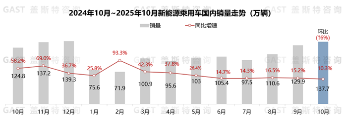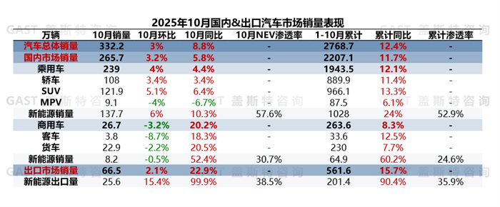 2025年10月,中國(guó)汽車(chē)市場(chǎng)銷(xiāo)售332.2萬(wàn)輛,環(huán)比增長(zhǎng)3%,同比增長(zhǎng)8.8%。這一增長(zhǎng)態(tài)勢(shì)的背后,是多重有利因素的共同推動(dòng):車(chē)市進(jìn)入“金九銀十”傳統(tǒng)銷(xiāo)售旺季,車(chē)企新車(chē)供給持續(xù)加碼,產(chǎn)能與交付節(jié)奏同步加快;與此同時(shí),NEV出口保持高增長(zhǎng)態(tài)勢(shì);加之2026年NEV相關(guān)優(yōu)惠政策已明確收緊,促使部分消費(fèi)者購(gòu)車(chē)需求前置,共同帶動(dòng)10月汽車(chē)市場(chǎng)穩(wěn)步增長(zhǎng)。