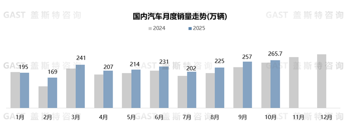 10月,國(guó)內(nèi)汽車(chē)市場(chǎng)銷(xiāo)售265.7萬(wàn)輛,環(huán)比增長(zhǎng)3.2%,同比增長(zhǎng)5.8%。其中,國(guó)慶期間車(chē)企推出專(zhuān)屬優(yōu)惠,帶動(dòng)國(guó)內(nèi)乘用車(chē)市場(chǎng)熱度回升;國(guó)內(nèi)商用車(chē)市場(chǎng)進(jìn)入“金九銀十”物流旺季,疊加政策驅(qū)動(dòng),同比增長(zhǎng)超20%。