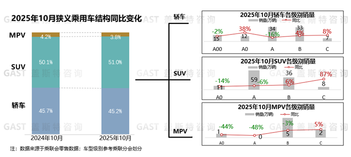 轎車(chē)份額為45.2%,同比下降0.5個(gè)百分點(diǎn)。A00及A0級(jí)市場(chǎng)銷(xiāo)量穩(wěn)定,A00級(jí)宏光MINIEV銷(xiāo)量突破6萬(wàn)輛,環(huán)比連續(xù)4個(gè)月正增長(zhǎng);A0級(jí)中繽果S上市首個(gè)完整月,銷(xiāo)量超1.7萬(wàn)輛。A、B級(jí)NEV增長(zhǎng)優(yōu)于ICE,零跑、紅旗等車(chē)型增長(zhǎng)較高;C級(jí)同比增長(zhǎng),其中享界S9T上市首個(gè)完整月銷(xiāo)量超4.8千輛。