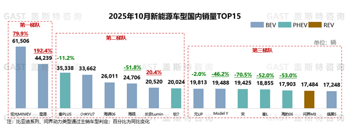 10月,比亞迪在TOP15中占據(jù)8席,仍保持?jǐn)鄬宇I(lǐng)先,但多數(shù)車(chē)型銷(xiāo)量同比出現(xiàn)較大下滑。具體來(lái)看,宏光MINI EV:四門(mén)版貢獻(xiàn)主要增量,單月銷(xiāo)量超6萬(wàn)輛,連續(xù)2個(gè)月保持同比超75%增長(zhǎng);吉利星愿:2026款新車(chē)上市,車(chē)型連續(xù)5個(gè)月銷(xiāo)量穩(wěn)定在4萬(wàn)輛以上;小米YU7:產(chǎn)能持續(xù)爬坡,累計(jì)訂單加速交付,月銷(xiāo)量突破3.3萬(wàn)輛;海鷗:受同級(jí)競(jìng)品影響,連續(xù)3個(gè)月同比降幅超45%;鈦7:上市首個(gè)完整月銷(xiāo)量超2萬(wàn)輛,成為當(dāng)前市場(chǎng)唯一銷(xiāo)量突破2萬(wàn)輛的方盒子SUV;宋:受外部同級(jí)競(jìng)品增多及內(nèi)部產(chǎn)品分流影響,月銷(xiāo)量排名跌出TOP10。