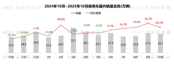10月,商用車(chē)國(guó)內(nèi)銷(xiāo)售26.7萬(wàn)輛,環(huán)比下降3.2%,同比增長(zhǎng)20.2%。去年同期基數(shù)較低,且政策推動(dòng)NEV商用車(chē)同比增長(zhǎng)超50%,使得國(guó)內(nèi)商用車(chē)市場(chǎng)同比高增長(zhǎng)。