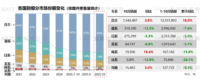 市場(chǎng)份額角度,10月自主品牌市場(chǎng)份額達(dá)到69%,同比增長(zhǎng)3個(gè)百分點(diǎn)。