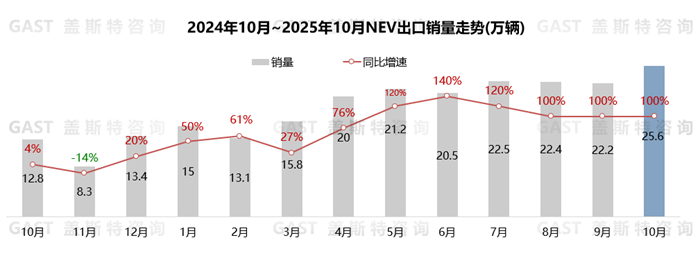 10月,新能源汽車(chē)出口25.6萬(wàn)輛,環(huán)比增長(zhǎng)15.4%,同比增長(zhǎng)99.9%。其中,插混占NEV出口份額同比提升16.4個(gè)百分點(diǎn),銷(xiāo)量同比增長(zhǎng)2.7倍。