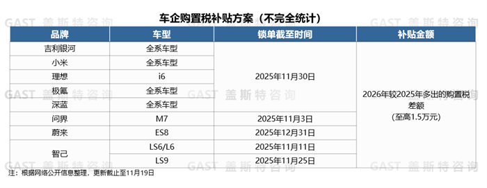 蓋斯特觀點(diǎn):車(chē)企推出購(gòu)置稅“兜底”方案,采用“提前鎖單+差額補(bǔ)貼”方式,一方面,刺激用戶消費(fèi),推動(dòng)訂單年內(nèi)轉(zhuǎn)化,助力今年交付量沖刺;另一方面,提前鎖定未來(lái)銷(xiāo)量,最大程度緩解2026年政策切換期帶來(lái)的經(jīng)營(yíng)風(fēng)險(xiǎn)。