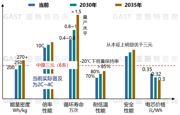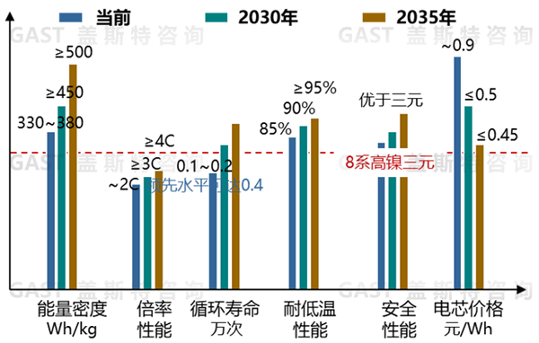在能量密度上,當(dāng)前已達(dá)到330~380Wh/kg,未來通過選用超高鎳正極、高硅負(fù)極,在2030年、2035年分別達(dá)到450Wh/kg、500Wh/kg。