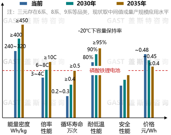 在耐低溫性能上,在-20℃環(huán)境下,磷酸鐵鋰電池容量保持率為60%~75%。預(yù)計(jì)通過材料優(yōu)化、系統(tǒng)級(jí)熱管理設(shè)計(jì)等方案,2030年-20℃下容量保持率可提升至80%,2035年進(jìn)一步提升至85%以上。