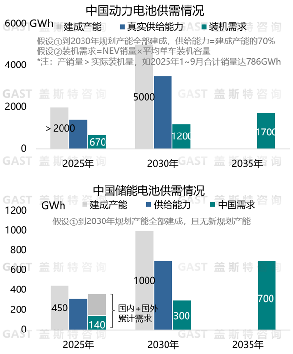 在動(dòng)力電池方面,目前中國電池產(chǎn)能已超過2000GWh,但中國實(shí)際裝機(jī)量不足1000GWh,因此過剩產(chǎn)能超過1000GWh。同時(shí),若規(guī)劃產(chǎn)能全部落地,到2030年中國動(dòng)力電池產(chǎn)能將達(dá)到5000GWh,屆時(shí),過剩產(chǎn)能將超過2000GWh。