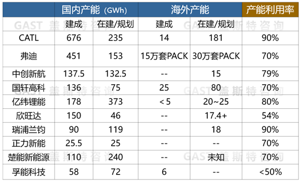 目前僅少部分企業(yè)掌握自研自產(chǎn)能力,該類企業(yè)通常擁有10年以上電池研發(fā)經(jīng)驗(yàn)積累且資金實(shí)力較雄厚,其中產(chǎn)能布局積極的企業(yè)現(xiàn)在基本處于產(chǎn)能過剩狀態(tài),布局節(jié)奏偏慢的企業(yè)產(chǎn)能尚不能滿足內(nèi)部需求。