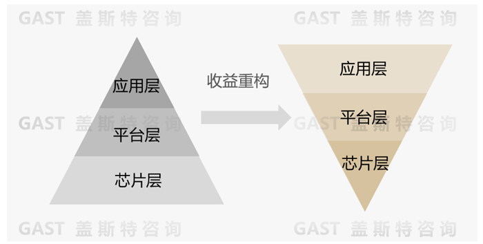 在3.0階段,以中央計算和區(qū)域架構為主流,企業(yè)競合格局趨穩(wěn),硬件標準化、軟件個性化推動價值重新分配,芯片、平臺、應用層的收益比重逐漸從芯片主導轉向平臺與應用層主導,如圖1所示,進而驅動產業(yè)生態(tài)重構。此階段車企主導芯片生態(tài)規(guī)則,掌握數據主權與算力調度主權;芯片廠商轉向算力服務化,通過接入車企算力池提供彈性支持;T1聚焦數字底座和平臺服務。在各方分工協同下,整供關系的核心也升級為芯片、算法、數據的協同運營。