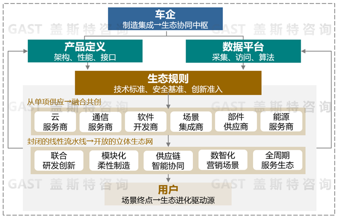 在生態(tài)化發(fā)展中,車企作為生態(tài)協(xié)同中樞,主導(dǎo)產(chǎn)品定義和數(shù)據(jù)平臺搭建,并制定生態(tài)規(guī)則;供應(yīng)商從單項(xiàng)供應(yīng)升級為融合共創(chuàng),深度參與產(chǎn)品研發(fā)、制造等全鏈條;用戶是生態(tài)進(jìn)化的驅(qū)動(dòng)源,用戶對產(chǎn)品使用的需求持續(xù)推動(dòng)企業(yè)迭代服務(wù)。這種生態(tài)化局面并非一蹴而就或短期內(nèi)即可達(dá)成的,需要整供企業(yè)持續(xù)推進(jìn)和開放共享,每家企業(yè)需要找準(zhǔn)自身的生態(tài)位置,明確核心能力和關(guān)鍵作用,做到“有所為”和“有所不為”。不同主體在開放合作中,基于專業(yè)能力分工,在合作中共贏、共享中獲利。